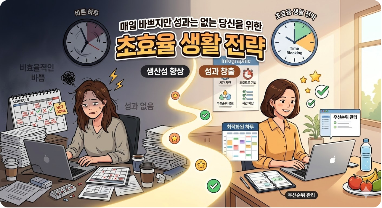 초효율 생활 전략: 시간과 에너지를 지배하는 법 Automated Content Strategy 매일 바쁘지만 성과는 없는 당신을 위한 초효율 생활 전략 시간과 에너지를 지배하는 법: GPT 기반 자동화 시스템으로 당신의 콘텐츠와 일상을 혁신하세요. 01 왜 우리는 항상 시간에 쫓기며 지쳐갈까요? 열심히 살고 있는데 결과는 제자리걸음인가요? 원인은 의지력이 아닌 시스템에 있습니다. 현대인의 에너지를 고갈시키는 핵심 요인들을 분석합니다. ● … 더 읽기