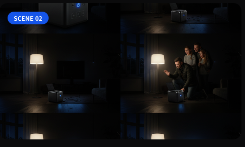 집에서 정전 대비는 물론, 야외 활동까지! 이동형 전력 솔루션 하나면 충분해! 모두 함께 만족스러운 미소를 지으며 엄지를 치켜세운다.