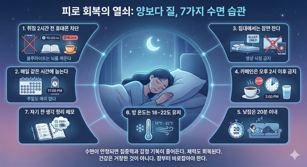 첫째, 취침 2시간 전 휴대폰 차단. 블루라이트는 뇌를 깨운다.
